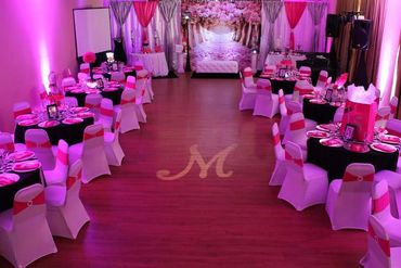 For lighting, we provided dynamic dance floor lighting along with uplighting throughout the tent, inside the house, terrace, and even the front of the house for a stunning ambiance. A motion monogram was projected inside the house, adding a personalized touch.